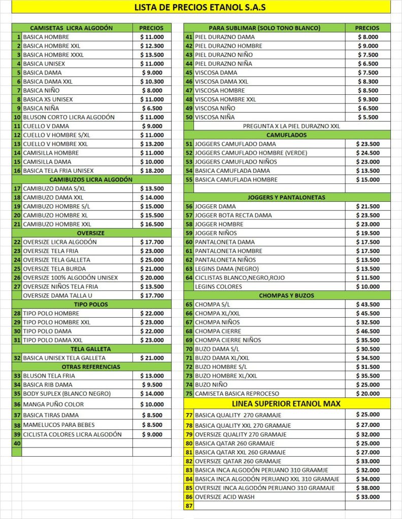 Lista de Precios Etanol Camisetas Consulta nuestra lista de precios actualizada de camisetas, joggers, busos y más. Elige tu referencia, define cantidades y haz tu pedido por WhatsApp ya al 300 816 6434 para cotización y disponibilidad inmediata. whatsapp whatsapp